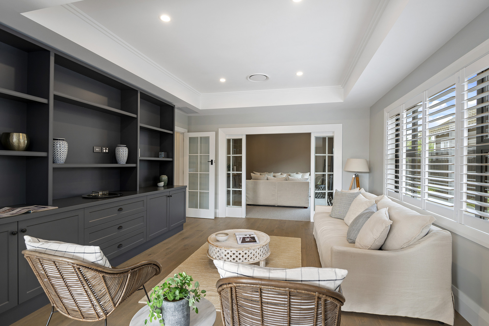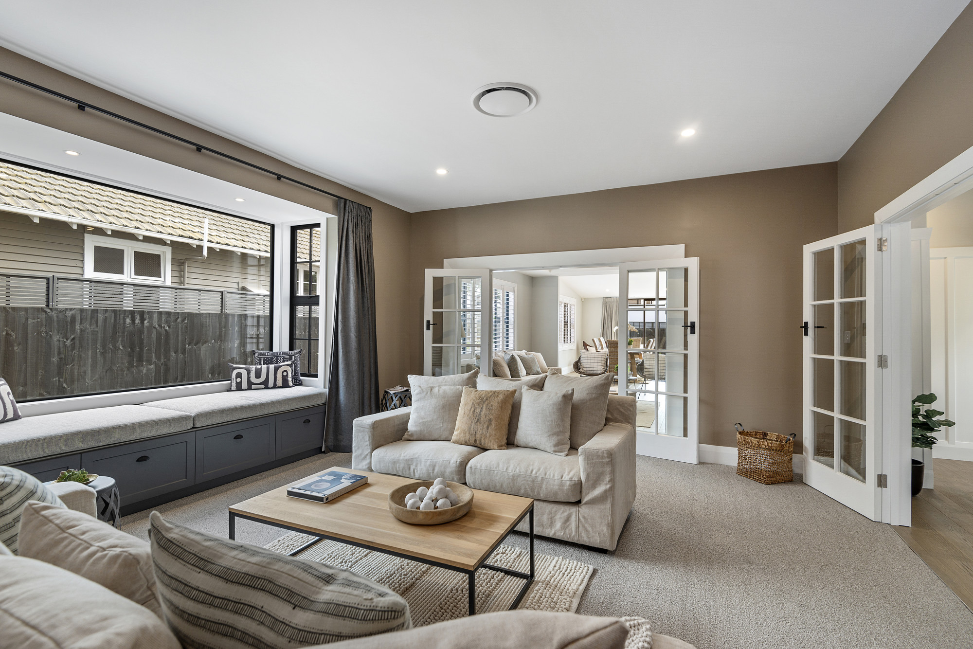 I was engaged to refresh this family home with a complete overhaul of the interior and exterior. I completed the colour and finish schedule, the custom kitchen/ laundry/ bathroom design and specifications. Selection and specification of flooring and all tiles. Bespoke design of built in cabinetry and window seat. I also specified all of the window treatments and decorative lighting for the home.